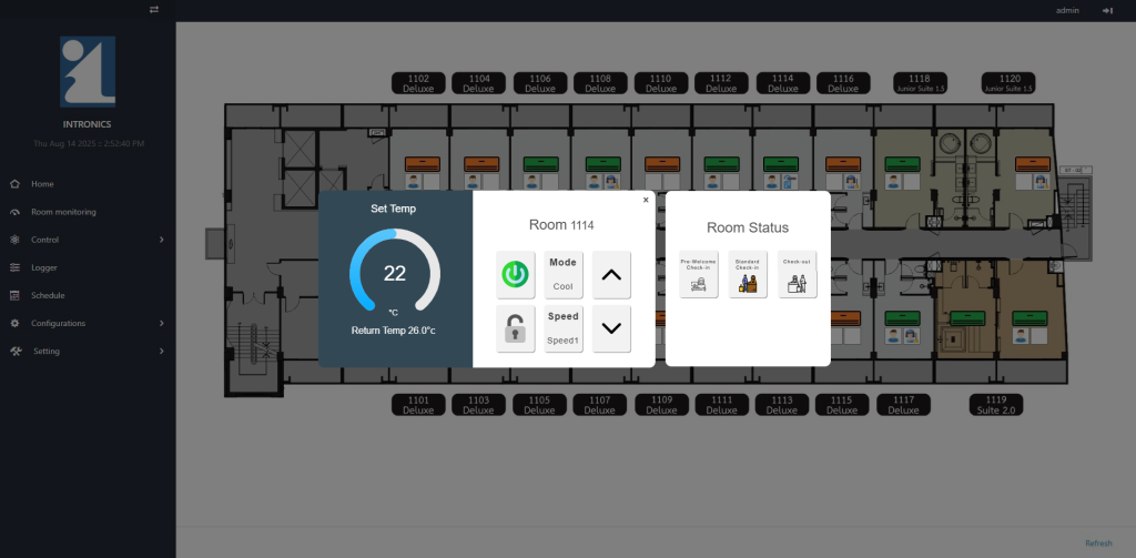 - Pre-Welcome Check-in Mode: This setting instantly activates the A/C in turbo mode for rapid cooling and switches the room lighting to a special “Welcome” mode creating a comfortable and inviting atmosphere for the guest.