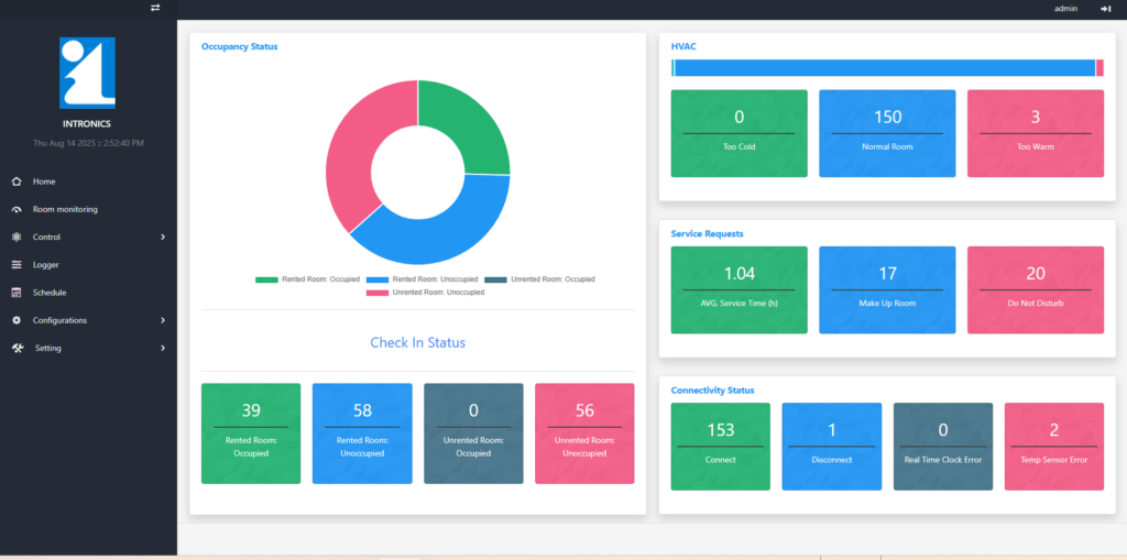 The i-SAVE Room Control unit provides several useful pieces of information, including occupancy status, room temperature status, the number of service requests, and the connectivity status to the central computer.